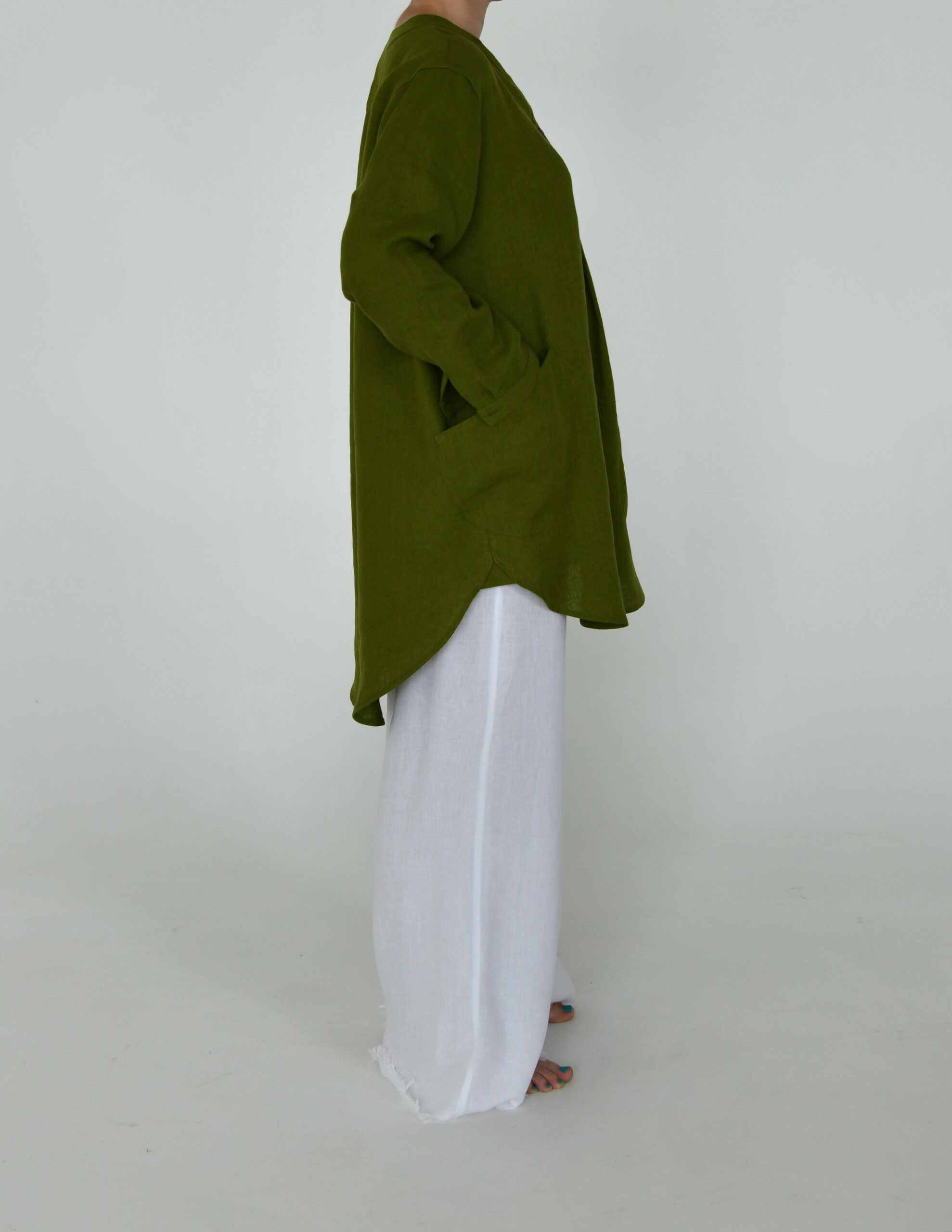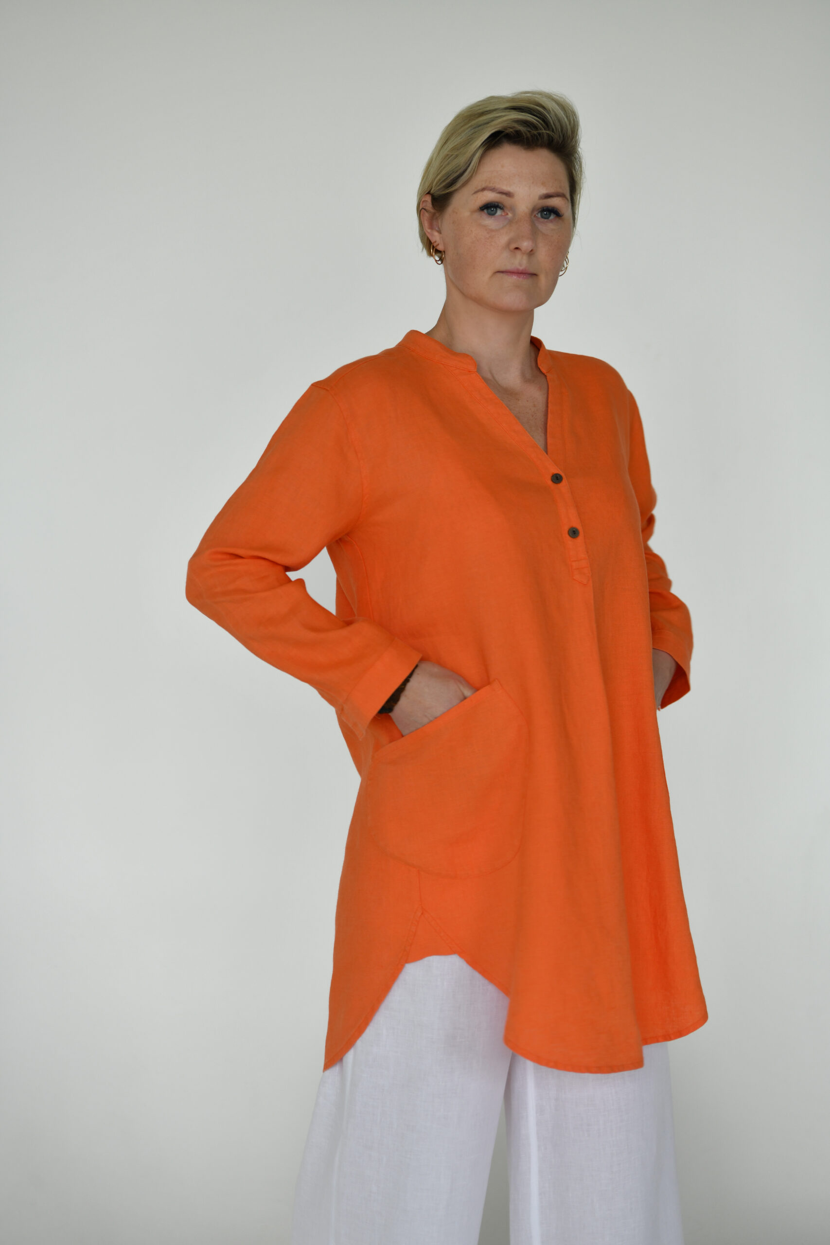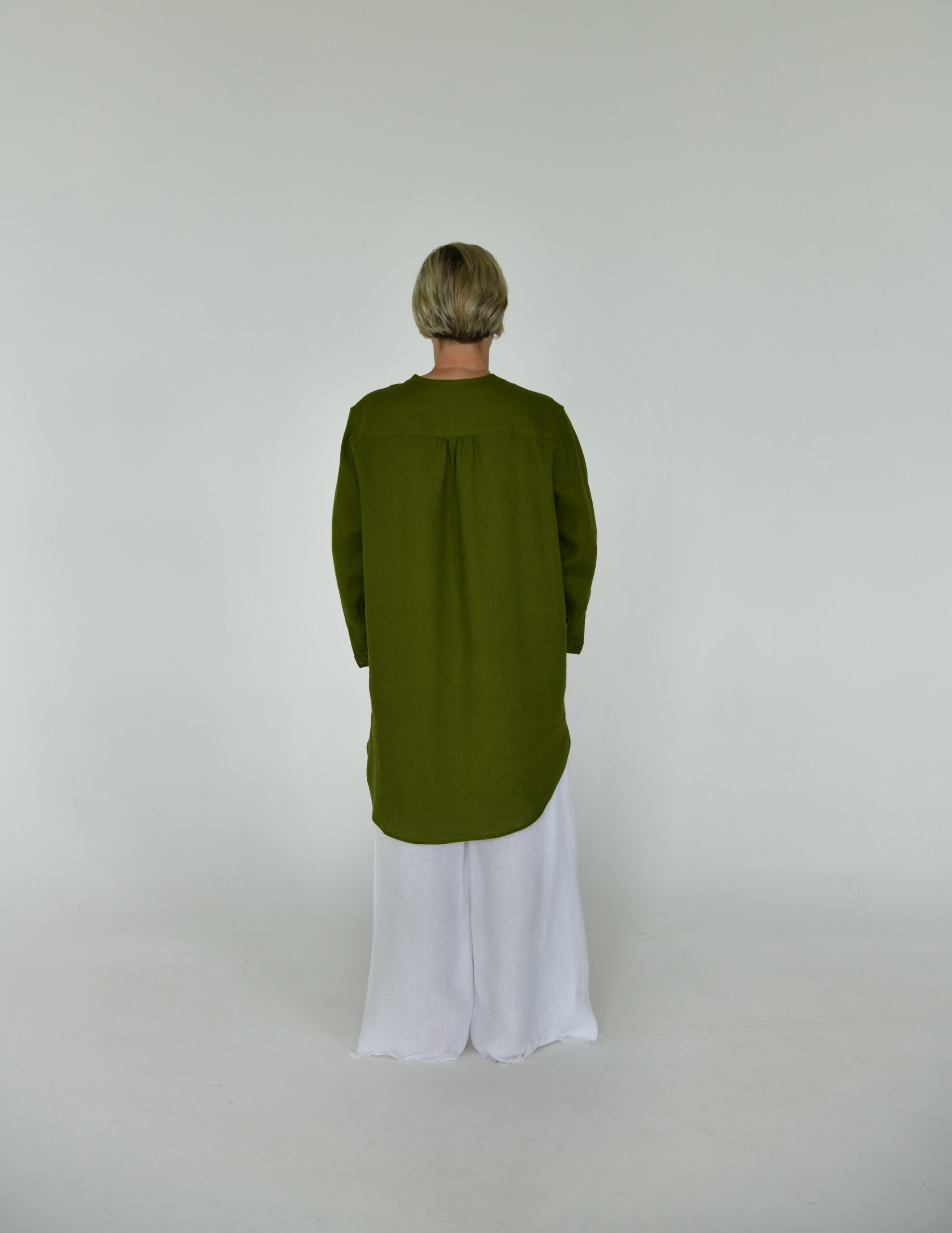 Lininė tiunika su uždėtinėmis kišenėmis. Rankovės ilgos, rankogaliai užsisega su sagutėmis. Galima dėvėti su kelnėmis ir be jų.