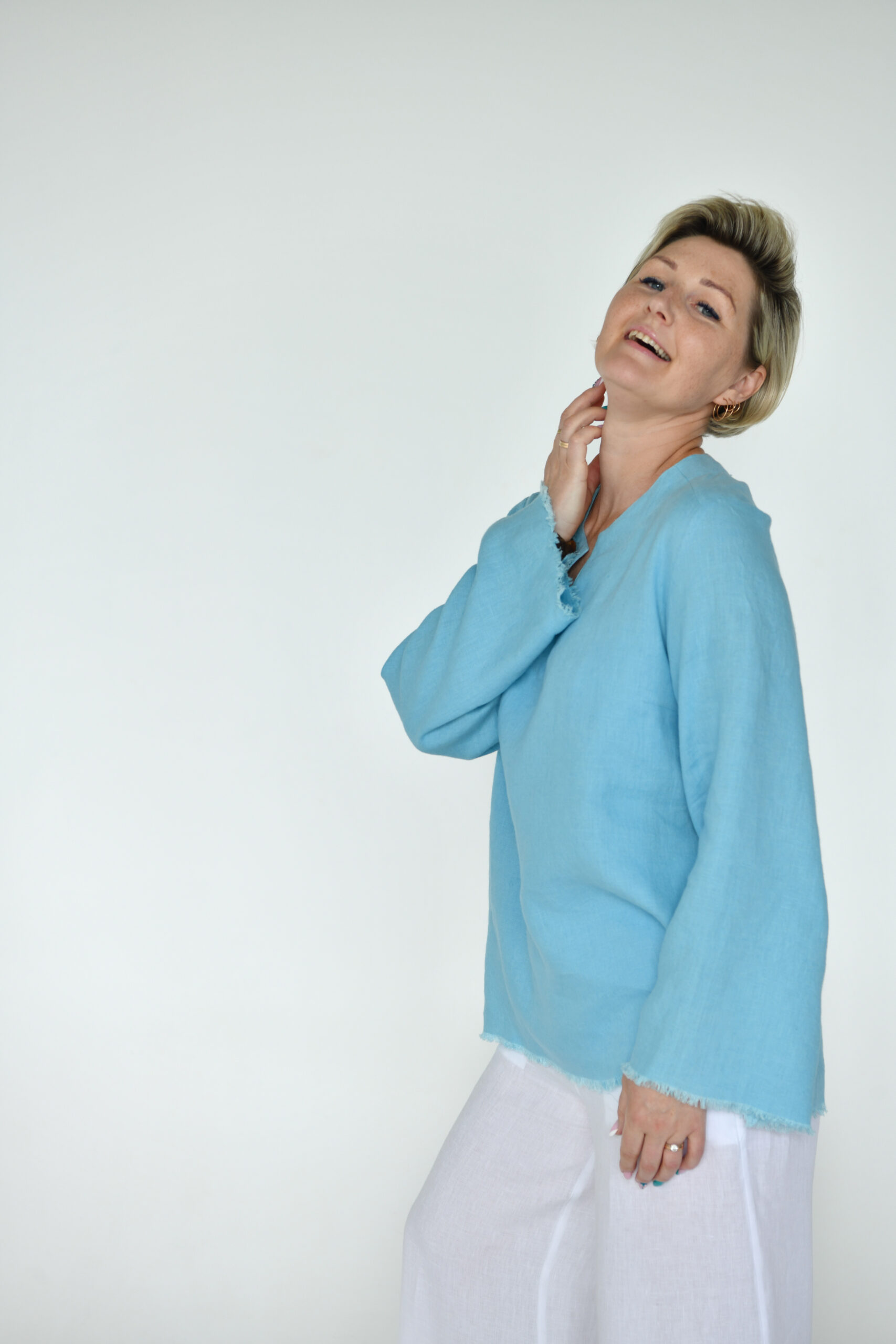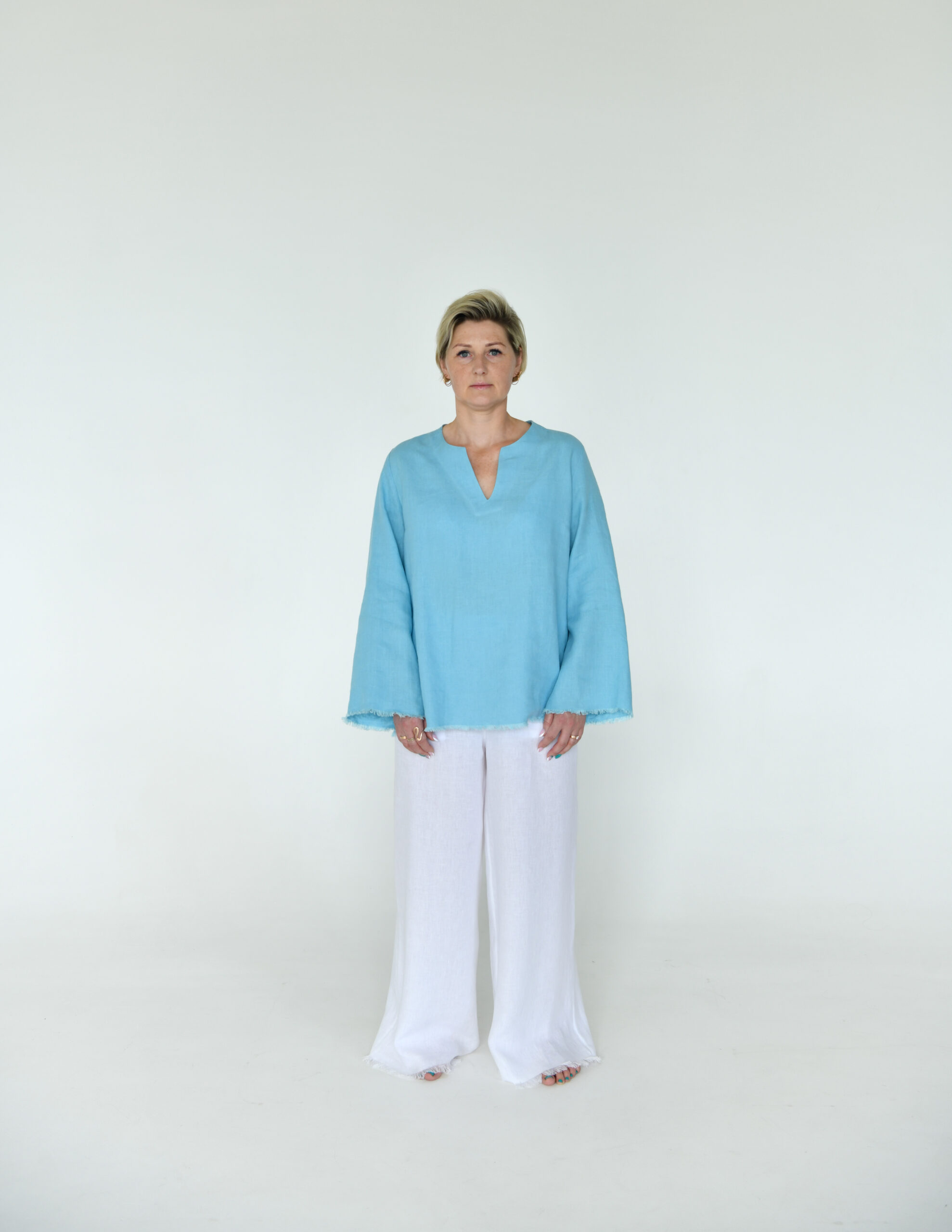 Dangaus spalvos lininė palaidinė su skeltukais šonuose, laisvos rankovės, apačioje kutai . Pagaminta su meilę Lietuvoje .