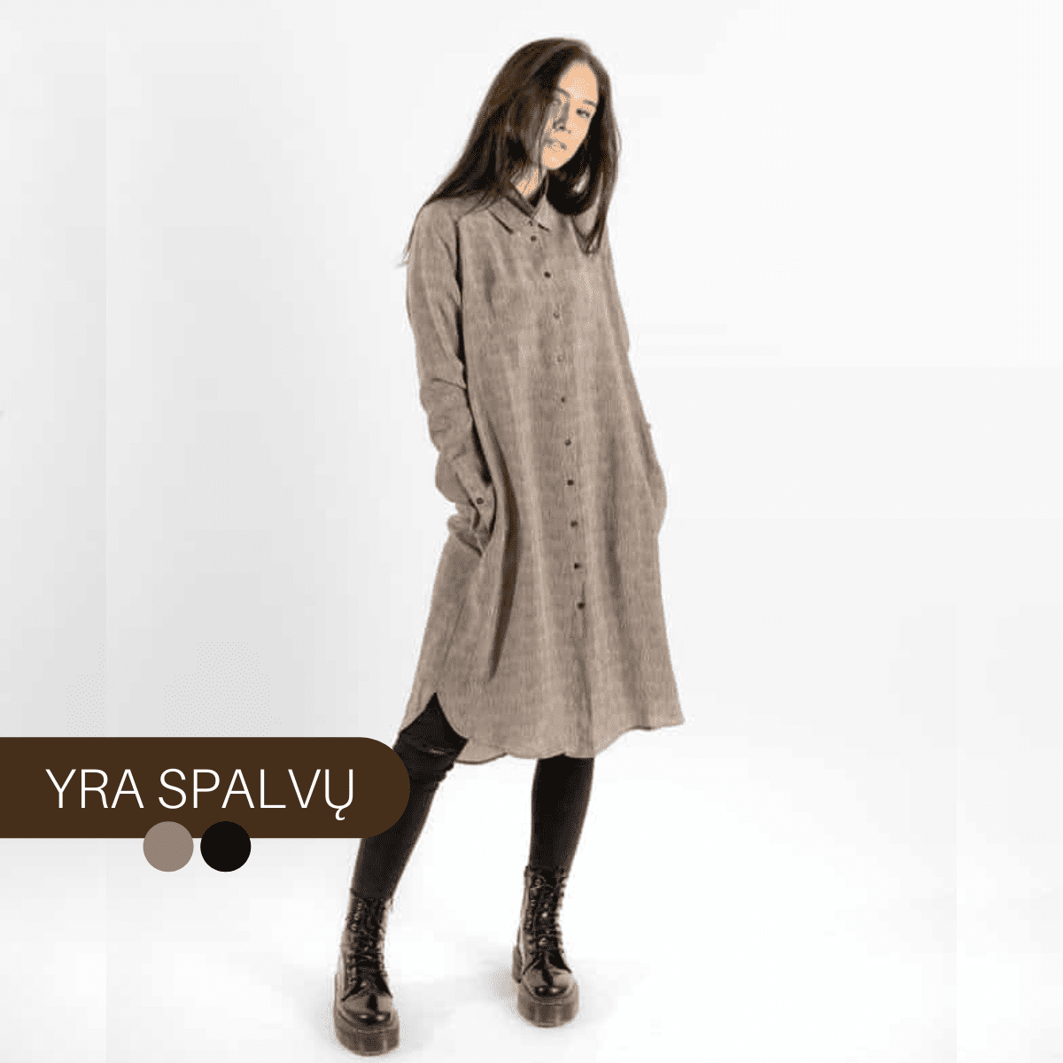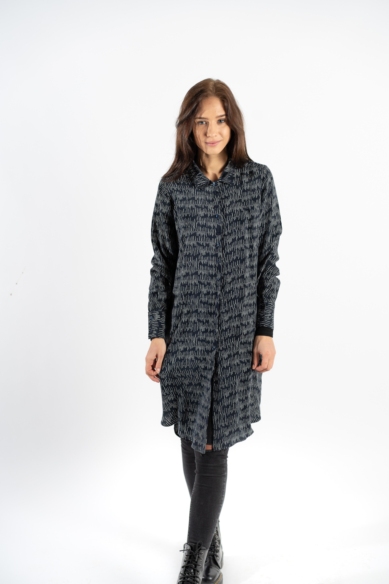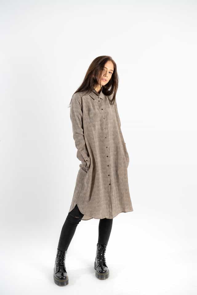 100% viskoziniai marškiniai, šlapio šilko jausmas dėvint, su kišenėmis ir dviguba apykaklę. Galima dėvėti ant kelnių ir kaip suknelę.